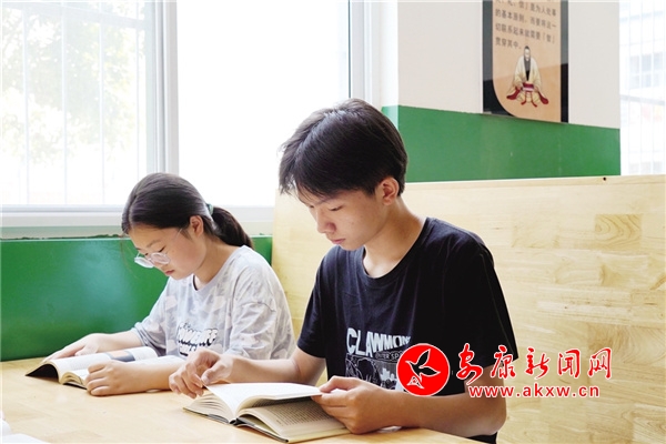 馬英琦(右)在石泉中學(xué)圖書館看書