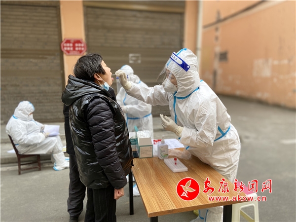 為方便群眾,各集中核酸采樣點設在戶外十字路口、小區空地等無遮擋的醒目位置,寒冷的天氣和讓醫護人員的面罩上多了一層霧氣,他們拿著采樣拭子的手也凍得很僵硬。工作人員的辛勞付出,居民們看在眼里,記在心中。“謝謝工作人員,我站幾分鐘就被寒風吹透,你們辛苦了。”家住池河鎮西苑社區的蔣大娘硬是將自己手中的熱水袋塞到醫護人員手中。