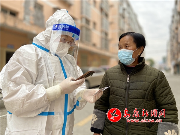 一人接著一人,一戶接著一戶,入戶采樣人員分散多地,醫護人員不停走村入戶,奔波于不同的小區,不同的樓層,拼著勁,拎著大包小包的防護與采樣物資,互相鼓勵著爬樓梯。每一次敲響居民家門,每到一戶家中,他們都會對居民進行詳細的信息登記、采樣、消毒,每個環節采集人員都一絲不茍地規范操作,叮囑每一位居民要做好防護。