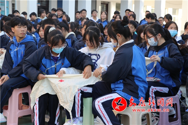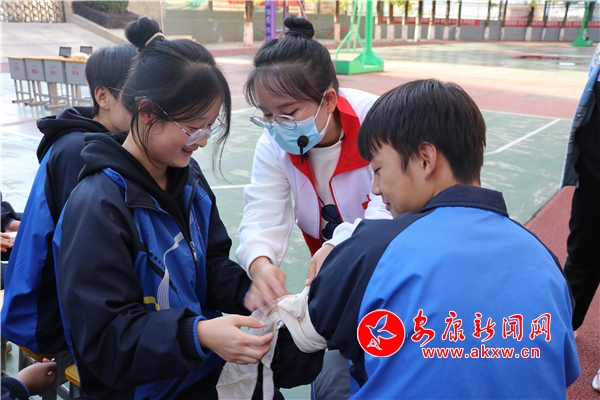 活動中,縣紅十字會工作人員向學生發放了三角巾,現場向學生講解了三角巾的結構和各部分的功能,并以手臂、肩部和胸部三個部位受傷為例做了操作示范,手把手地指導學生如何包扎、如何敷料、如何固定、如何打結。同學們邊觀察邊實操,不時和工作人員進行互動,尋求專業指導,親手體驗三角巾包扎的操作流程,在鍛煉動手實踐能力的同時,掌握身體受傷的應急處理技能,增強應對突發事件的自護自救和科學救護能力。