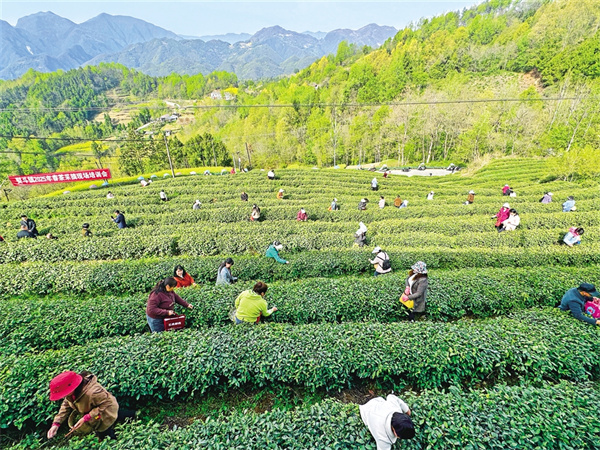 春風(fēng)拂綠,茶山疊翠。走進(jìn)石泉縣熨斗鎮(zhèn)佛坪嶺茶園,茶樹(shù)新芽吐翠,茶壟依山勢(shì)盤(pán)旋而上,層層疊疊如綠色波浪,與遠(yuǎn)處金黃的油菜花田交織成春日畫(huà)卷!