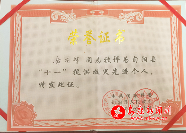 而岳有智也用自己的實際行動真正詮釋了軍人“退伍不褪色”的內涵,被組織表彰為“抗洪救災先進個人”。vwL安康新聞網