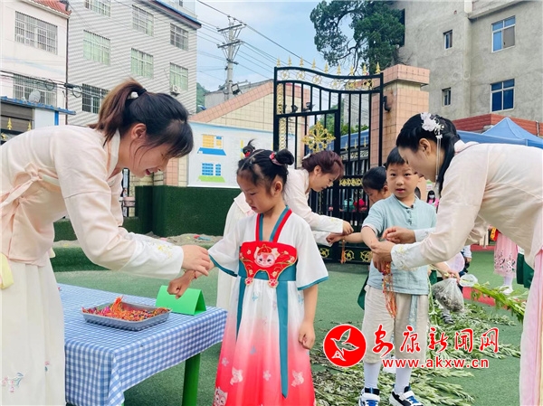 活動前,老師們精心準備了主題教育,通過視頻、兒歌教學、師幼互動等形式一起追溯端午節(jié)的由來,講述屈原的愛國故事,了解端午節(jié)吃粽子、賽龍舟、掛艾草、做香包等習俗;顒诱介_始,只見老師和孩子們身著漢服,仿佛回歸漢唐。孩子踩著一條由艾草鋪成的道路,老師依次為小朋友系“五彩繩”、雄黃“畫額”、“沐蘭湯”凈手,寓意驅(qū)邪避蟲,祝福孩子平安健康。儀式結(jié)束后,孩子們在院內(nèi)品嘗了各式香粽、大蒜、雞蛋和水果。隨后又在班級制作了端午吉祥物——香包,并相互佩戴。最后,大家齊聚院內(nèi),開展了“賽龍舟”、投壺、射五毒等端午傳統(tǒng)游戲活動。