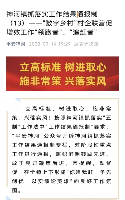 一套管理制度,持續鞏固深化作風建設。為了持續鞏固深化作風建設,鎮黨委政府在實行干部管理日簽到制、去向登記制、周例會制等管理制度的基礎上,堅持立高標準,樹進取心、施非常策,興落實風,制定出臺了“工作安排清單制、工作內容量化制、工作進度限時制、工作成果通報制、工作成效獎懲制”的“五制”工作法,圍繞“經濟穩增長、項目建設、招商引資、營商環境、鄉村振興、疫情防控、防汛防滑、民生保障、安全生產、信訪維穩、環境衛生綜合整治”等重點工作推進落實情況,在“平安神河”公眾號開辟神河鎮抓落實工作結果通報制專欄,對階段性重點工作進行通報,旗幟鮮明鼓勵先進,敢于亮丑鞭策后進,常提醒,勤督促,在全鎮上下形成“你追我趕,爭先創優,以實績論英雄”的良好工作氛圍。作風建設開展以來,通過五制工作法在“平安神河”公眾號進行抓落實工作結果通報13期,收到良好效果。下一步將作風建設與“五制工作法”有機結合,堅持常抓長效、常管常嚴,深化作風建設落地見效,以過硬的作風抓黨風促政風帶民風樹新風,促進鎮域經濟社會高質量發展,喜迎黨的二十大勝利召開。