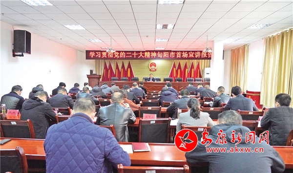 黨的二十大為新時代新征程黨和國家事業(yè)發(fā)展、實現(xiàn)第二個百年奮斗目標擘畫了發(fā)展藍圖、規(guī)劃了實踐路徑、作出了戰(zhàn)略部署。旬陽市委第一時間召開會議、印發(fā)通知,要求全市各級黨組織和廣大黨員把學習宣傳貫徹黨的二十大精神作為當前和今后一個時期的重大政治任務(wù),迅速興起學習熱潮。去年10月24日以來,市委先后召開6次會議集中學習黨的二十大精神,10月28日,全市黨員干部學習黨的二十大精神集中培訓會順利召開,11月22日,旬陽市黨的二十大精神宣講工作全面啟動,市委書記陳紅星在城關(guān)鎮(zhèn)開展黨的二十大精神首場宣講,以上率下做好宣講“頭等大事”。市委書記的帶頭宣講宛如一聲“發(fā)令槍”,引領(lǐng)全市宣講不斷走深走實。隨后,其他市級領(lǐng)導、各鎮(zhèn)黨委書記和市直部門主要負責同志,均深入基層或在分管領(lǐng)域、本單位本系統(tǒng)開展宣講90余場次,切實推動黨的二十大精神進黨政機關(guān)、進企事業(yè)單位、進城鄉(xiāng)社區(qū)、進校園課堂、進各類新經(jīng)濟組織和新社會組織。