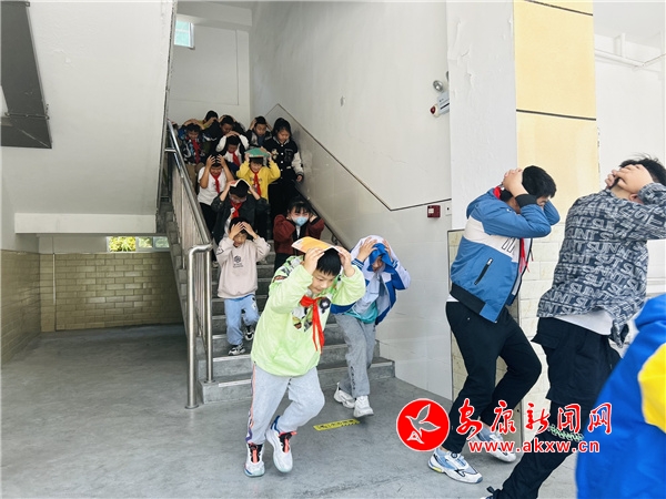 片刻之后,要求師生疏散撤離教學樓的指令發出,各班學生在老師的組織下沿指定路線撤離。行進中,大家降低身體重心躬身前行,有的用雙手捂住頭部,有的用書本遮蓋頭頂,以最快的速度向安全疏散點轉移,整個疏散撤離過程快速而有序,僅用時1分40秒,600余名師生便安全撤離至學校操場,實現了預期演練目標。