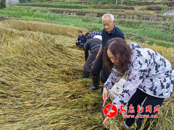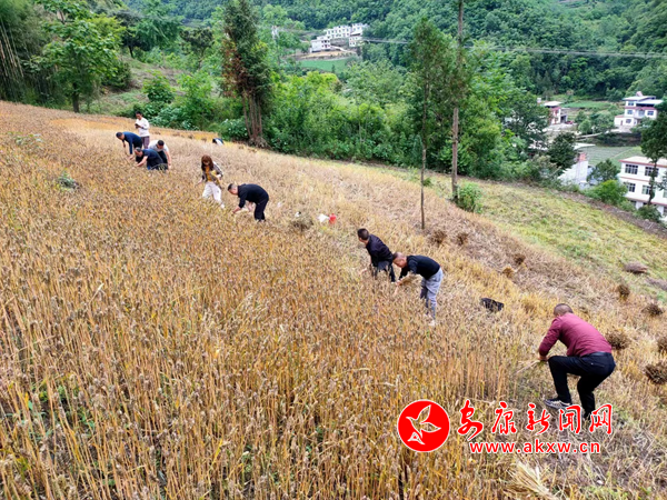 “大家再加把勁兒,這一塊馬上要收割完了,完了我們轉(zhuǎn)戰(zhàn)老李家。”在黑溝村二組石槽溝梁利鵬的麥田里,鎮(zhèn)村黨員干部、左鄰右舍與“時間”賽跑,割麥、捆扎、搬運……大家分工協(xié)作,動作嫻熟利索、揮汗如雨,不一會兒,五畝小麥全部收割完成。