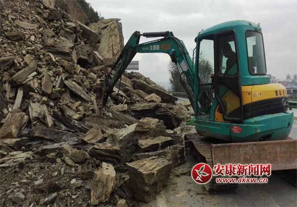 安康新聞網訊 (通訊員 葛松 張歡) 10月29日上午,瀛湖干道K1+050處,一臺挖掘機一臺裝載機正在緊張清除道路塌方。vsq安康新聞網