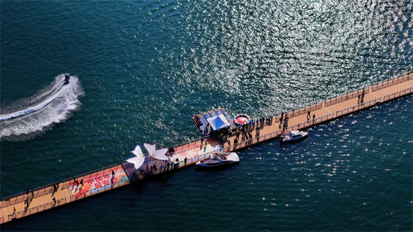 游客輾轉(zhuǎn)至瀛湖浮橋,水上運動中心也已喬遷至此。精彩刺激的水上項目,吸引了年輕人的極大興趣。水上摩托艇、水上陀螺、水上拖傘。以及靜態(tài)水域的水上滾筒、水上皮劃艇、水上手搖船,都成了游客今年第一次親水的最佳載體,怎一個酣暢了得。