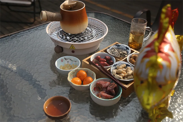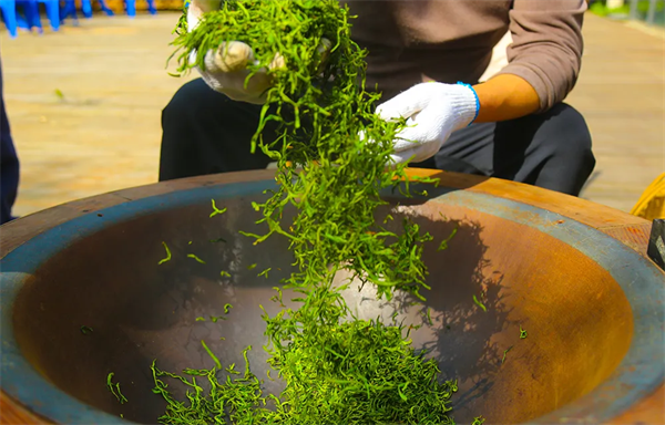 翠屏島瀛湖茶舍,我們推出了圍爐煮茶項目,炒茶師傅現(xiàn)場殺青、揉捻、干燥,隨后將瀛湖的明前茶呈送到游客面前。當然,游客若有興趣,也可親自實操這難能可貴的體驗。