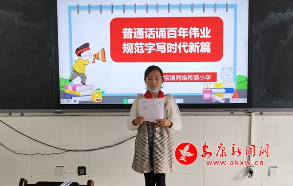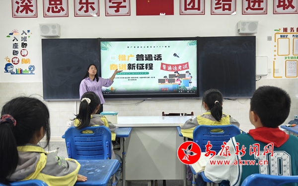 在課間,學校師生以具體形象、通俗易懂的語言,詮釋了自己對普通話和規范簡化字的認識。在主題班會上,各班借助PPT、宣教片等形式向學生科普了普通話的由來、普通話水平等級、不規范簡化字、《通用語言文字法》的解讀、文學名著中的偏僻字音等知識,號召大家“講普通話,寫規范字”,積極主動地弘揚民族語言文化。