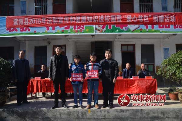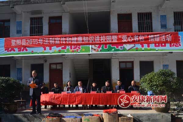 安康新聞網訊 (通訊員 肖寶) 在“12•4”國家憲法日暨全國法制宣傳日即將到來之際,11月26日,由紫陽團縣委舉辦的紫陽縣2015年法制宣傳和健康知識進校園暨“愛心書包”捐贈活動走進斑桃小河小學。活動現場,紫陽團縣委為全校學生購買了價值1.5萬元的愛心書包和手套,并及時發放到了每個學生的手中。