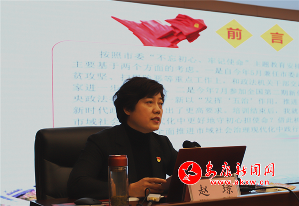 本網訊 11月1日,市委副書記、政法委書記趙璟以“推進‘五治’融合,打造善治安康”為題,為政法委系統干部講授“不忘初心、牢記使命”主題教育專題黨課。