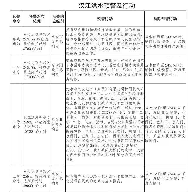 根據《安康市人民政府關于印發安康城區防汛抗洪預案的通知》有關漢江洪水預警及行動的內容:URn安康新聞網