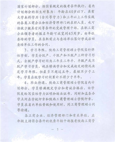 按照省政府有關文件規定,學員修滿規定的課程學分,完成畢業論文,通過論文答辯及評審后,由陜西工商管理碩士學院頒發畢業證書和學力證明。學員在省內單位晉級和使用時,視同工商管理碩士。dmu安康新聞網