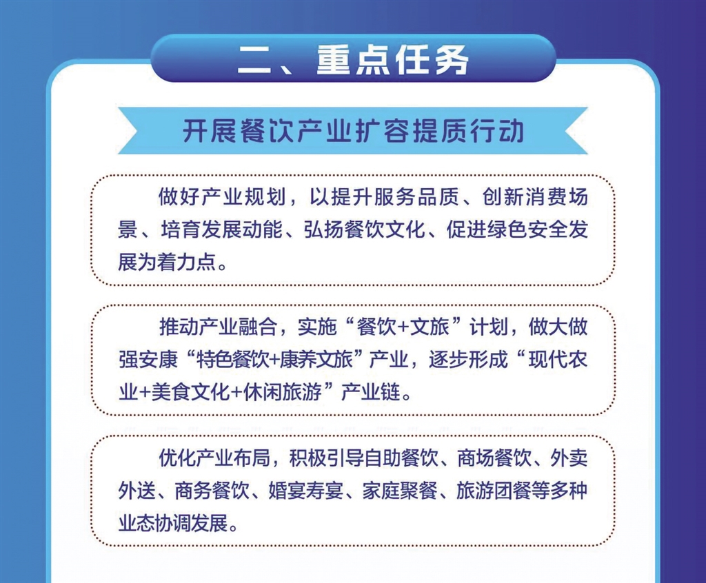 日前,安康市商務局等11部門聯合發布《關于進一步推進全市餐飲業高質量發展的實施意見》,本期帶您一圖讀懂其重點任務。