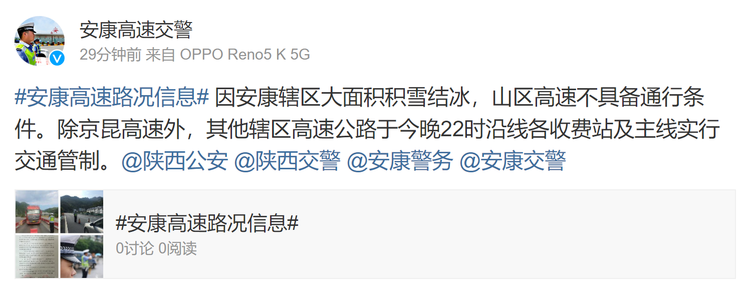 據安康高速交警消息:因安康轄區大面積積雪結冰,山區高速不具備通行條件。除京昆高速外,其他轄區高速公路于今晚(2月22日)10時沿線各收費站及主線實行交通管制。