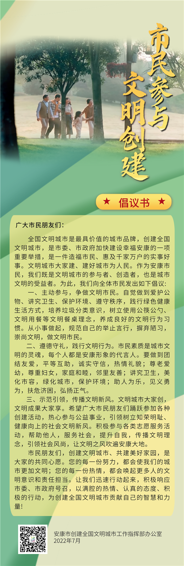 全國文明城市是最具價值的城市品牌,創建全國文明城市,是市委、市政府加快建設幸福安康的一項重要舉措,是一件造福市民、惠及千家萬戶的實事好事。文明城市大家建、建好城市為人民。作為安康市民,我們既是文明城市的參與者、創造者,也是城市文明的受益者。為此,我們向全體市民發出如下倡議: