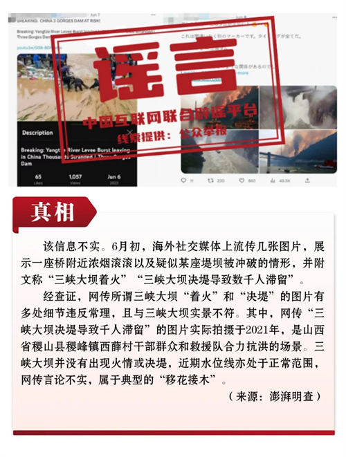 移花接木,憑空捏造事實博關注。縱觀6月網絡謠言,還需警惕的是,個別網民為博取關注,不惜移花接木、憑空捏造不實信息。如有網民惡意造謠“山西一女幼師給幼兒喂避孕藥”“上海仁濟醫院(東院)存在醫生嫖娼、組織賣淫”,經調查,這些人造謠的目的純屬是為了吸引眼球、博取關注,均已被警方依法嚴肅查處;海外社交媒體上流傳所謂“三峽大壩‘著火’‘決堤’”,也是以移花接木伎倆,往我國家標志性工程身上“潑臟水”;而網傳“上海市司法局擬錄用的38名公務員大部分是留學生”,則是對今年上海公務員招錄工作的歪曲混淆、以偏概全,其真實目的是吸引眼球、獲取流量,謀取私利。
