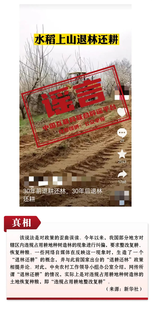 歪曲杜撰,冒用官方名義設騙局。不法分子冒用國家部委、國企或權威機構名義,偽造文件、捏造虛假信息對外發布,企圖擾亂正常市場秩序并從中行騙牟利。諸如“財政部發行金融債券”“三部門聯合發文將發放家庭農場等專項涉農補貼”“國鐵集團授權‘八縱八橫 ’APP推出理財產品”“中國商飛發布‘C919私募基金’等投資理財項目”等信息迷惑性極強,實為騙子以高額返利為誘餌設置的陷阱。此外,還有自媒體歪解誤讀公共政策,有意混淆概念誤導公眾。如,針對“違規占用耕地整改復耕”,生造“退林還耕”概念,并將其與此前國家出臺的“退耕還林還草”政策相提并論,實質是對加強耕地保護和用途管控的歪曲。