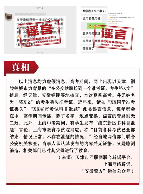 謠言7:天津、安徽等地考生“駱X文”丟失準考證?上海浦東新區中考多科目泄題?