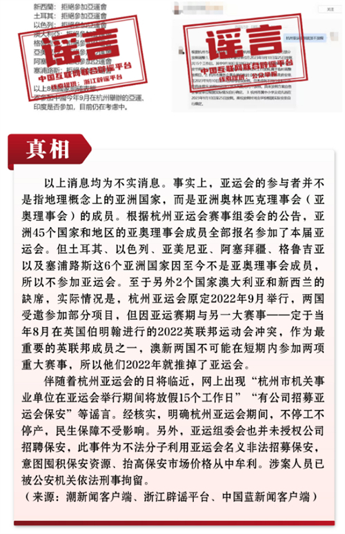 謠言6:八個(gè)國家宣布不參加杭州亞運(yùn)會?杭州因舉行亞運(yùn)會將于9月10日至25日放假?siQ安康新聞網(wǎng)