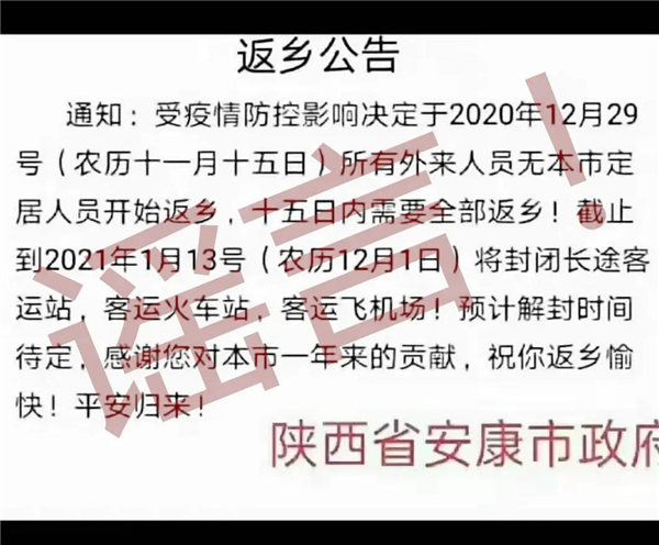 請注意!近日有不法分子冒充安康市政府在網上發布《返鄉公告》