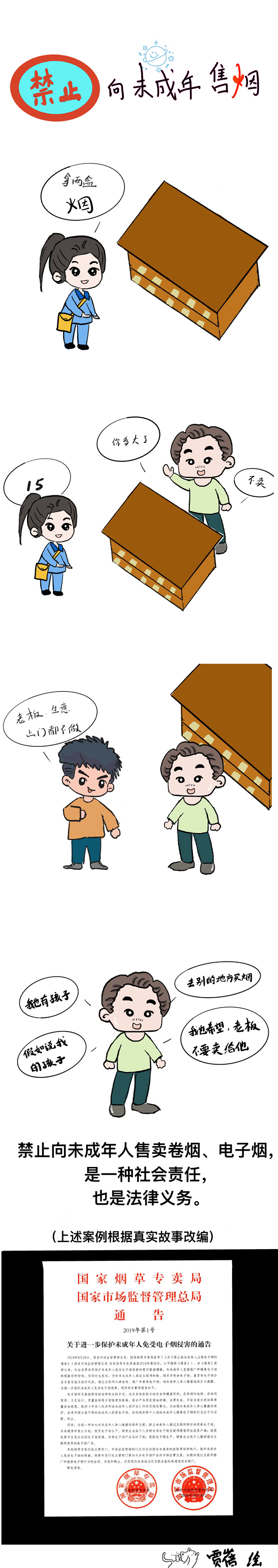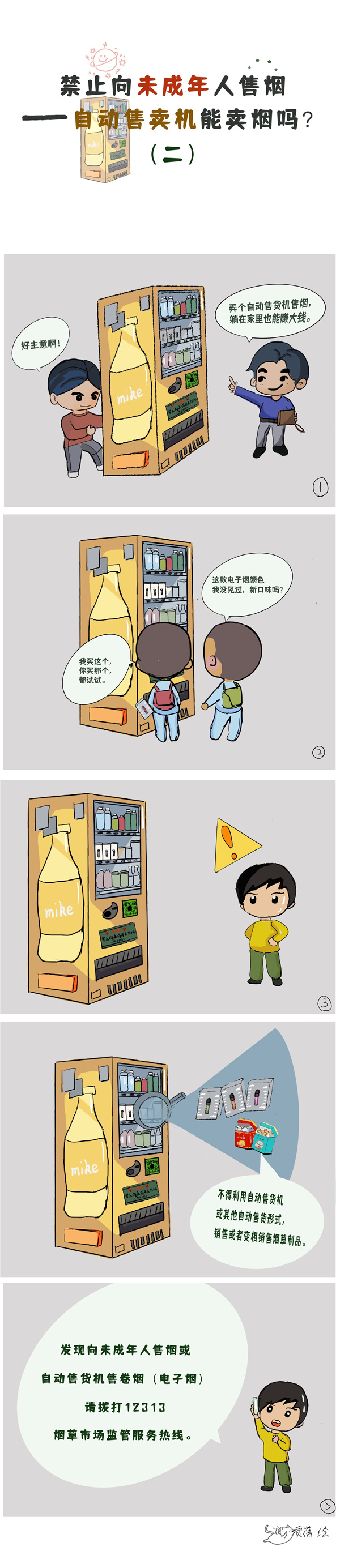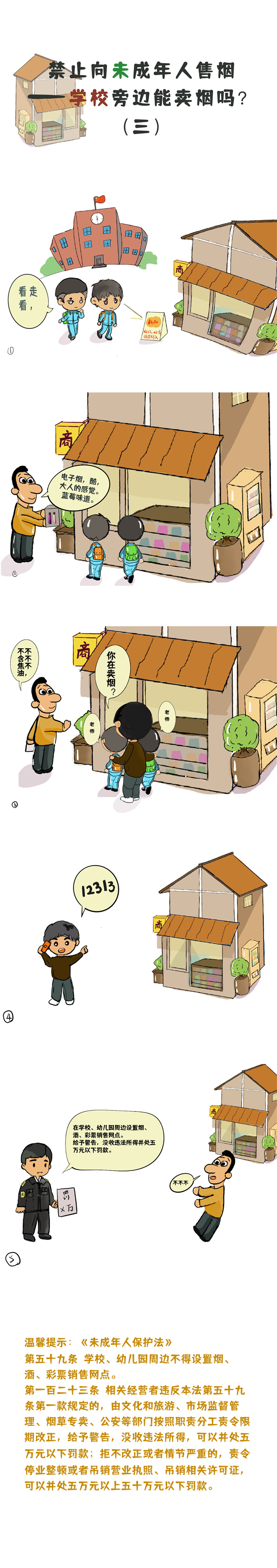 《中華人民共和國未成年人保護法》中提到禁止向未成年人售煙,那么生活中遇到這些情況我們該怎么做呢?請看下列漫畫。(賈蓓 繪制)