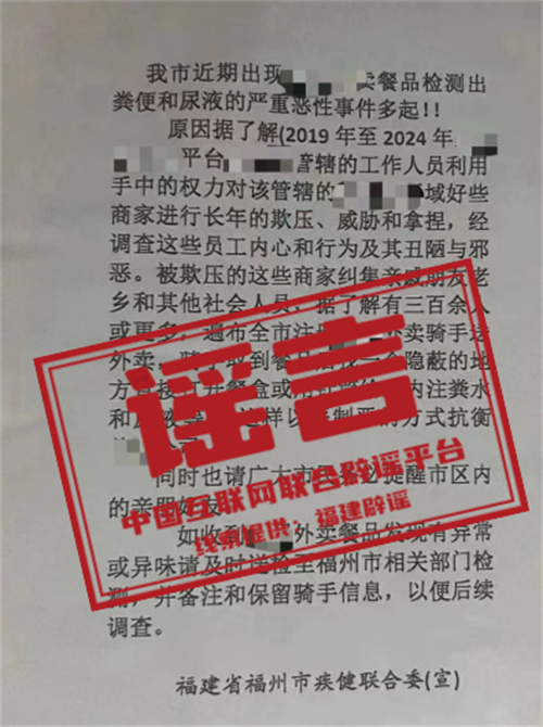 謠言:“福建省福州市疾健聯合委”發文稱“某外賣平臺餐品檢出糞便和尿液”?jDd安康新聞網
