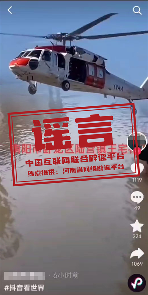 7月15日,網民“賓利xx”在某短視頻平臺發布視頻稱“南陽市臥龍區陸營鎮王莊村被水淹,臥龍區使用直升機進行救援”。經核實,臥龍區未使用直升機進行救援,視頻是發布者使用軟件拼接而成,系虛假信息。