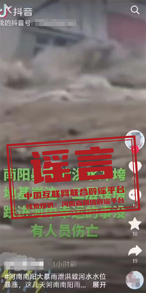 7月15日,網民“神x”在某短視頻平臺發布“貨車司機被淹”視頻,并配文稱“可憐啊,就這樣吧,一路好走”。經核實,7月14日,鄧州市鐵路橋下一外地牌照貨車被淹,車內被困人員已被成功救出,無人員傷亡,該信息與事實嚴重不符,系虛假信息。