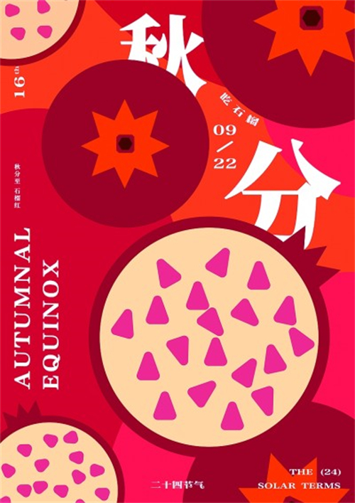秋分到,柿子紅。柿子又稱“朱果”,立秋之后的柿子更加甜美可口。圖①作品取柿子的吉祥寓意,刻畫了一幅秋柿高掛枝頭的場景,成熟的柿子飽滿而有光澤,看起來非常吸引人。圖②則以“秋分吃石榴”為主題展開創作,將俯視的石榴與切開的石榴圖形化,通過形狀的大小對比以及色塊的明度變化,增加了海報的視覺層次感和前后縱深感,使單一元素變得豐富;在色彩選擇上,通過暗紅色與淡黃色的對比,帶來了比較跳躍的視覺體驗。vHh安康新聞網
