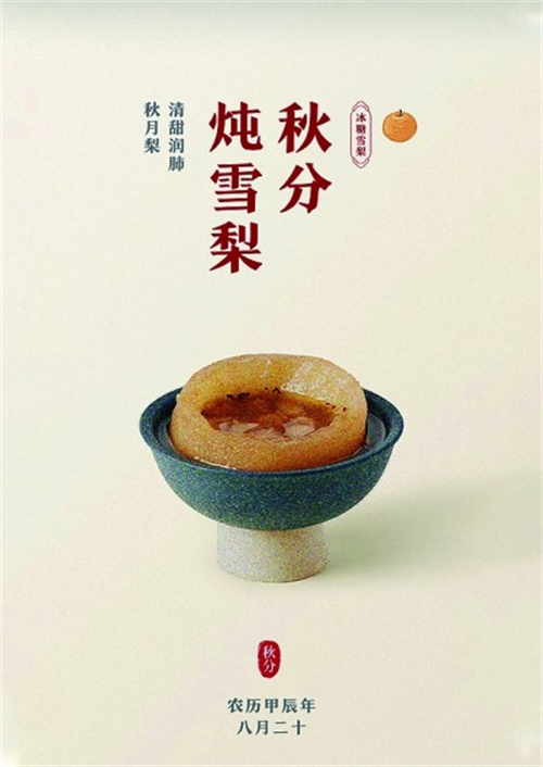 秋風漸起,寒涼氣息加重。秋分時節在飲食調養方面,應多喝水,吃清潤的食物。圖⑦設計的中心元素是冰糖燉雪梨,象征秋季的清潤與養生,也暗示了秋分時節陰陽調和、天地平衡的自然哲理。vHh安康新聞網