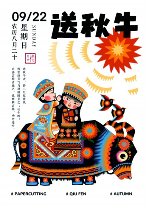 秋分是一個重要的農業節氣,也是中國傳統文化中的重要時刻,民間很重視秋分節氣,有著各種秋分習俗。例如“送秋牛”,一般在紅紙或黃紙上畫農夫耕田圖樣,再印上全年農歷節氣情況,送圖者都是些民間善言唱者,主要說些秋耕吉祥、不違農時的話。圖③借用工藝美術家庫淑蘭的剪紙作品形式,將其基本圖形進行組合再創作,配色選用橙黃為主、藍色為輔,顯得既貼近傳統,又生動有趣。vHh安康新聞網