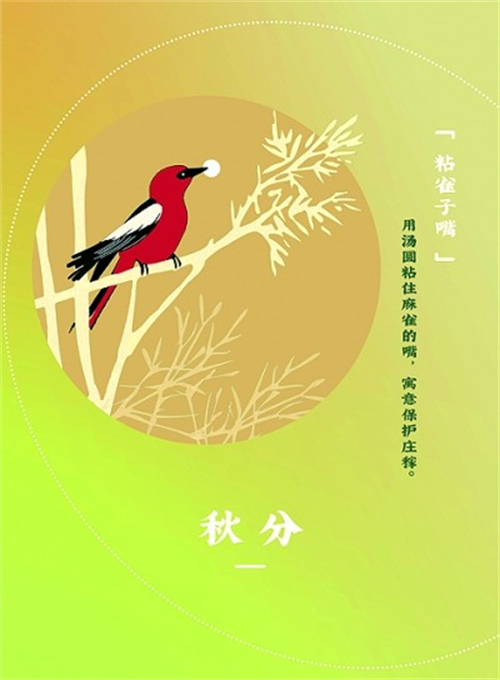 秋分的另一個有趣習俗是“粘雀子嘴”,即用一些沒有餡兒的糯米團子,以竹簽串好插在田間地頭,喂食給鳥雀,寓意“粘住麻雀的嘴”,以保護莊稼、確保糧食收成。圖⑤作品采用橙黃和黃綠色調,營造出秋日的溫暖氛圍;海報中央的圓形圖案框是湯圓的抽象再現,圓框內麻雀站在枝頭,嘴中叼著軟糯的湯圓,形象地展現了“粘雀子嘴”的習俗。vHh安康新聞網