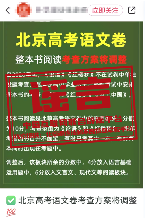 真相:近日,關于“北京高考語文學科整本書閱讀考查方式調整”的消息在網絡上傳播,引發社會發注。對此,北京教育考試院發表聲明稱:該網傳內容為不實信息。北京教育考試院沒有發布對北京高考語文整本書閱讀考查方式調整的相關內容,北京高考語文2025、2026年的學科考試內容保持穩定,范圍不變。(來源:北京市違法和不良信息舉報平臺、“首都教育”微信公眾號)