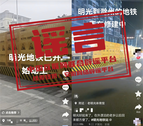 真相:近日,網民“張**”“沙**”等發布視頻,編造并傳播“明光地鐵已開始動工”相關虛假信息,并配以誤導性視頻,引發關注和討論。經核實,相關視頻內容對應區域施工項目并非修建地鐵,網傳視頻系謠言。明光市委網信辦和市公安局已依法對張某、沙某等進行批評教育,并要求其刪除相關不實信息。(來源:“安徽省互聯網違法和不良信息舉報”微信公眾號、明光市委網信辦)4R9安康新聞網