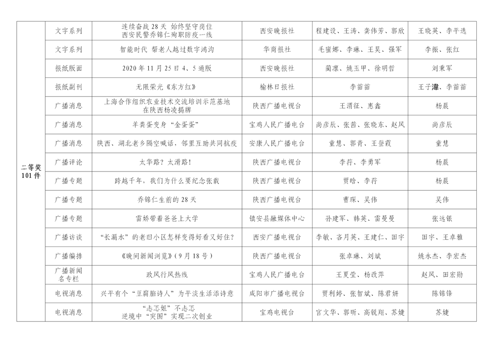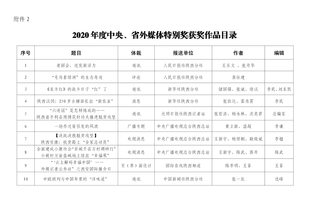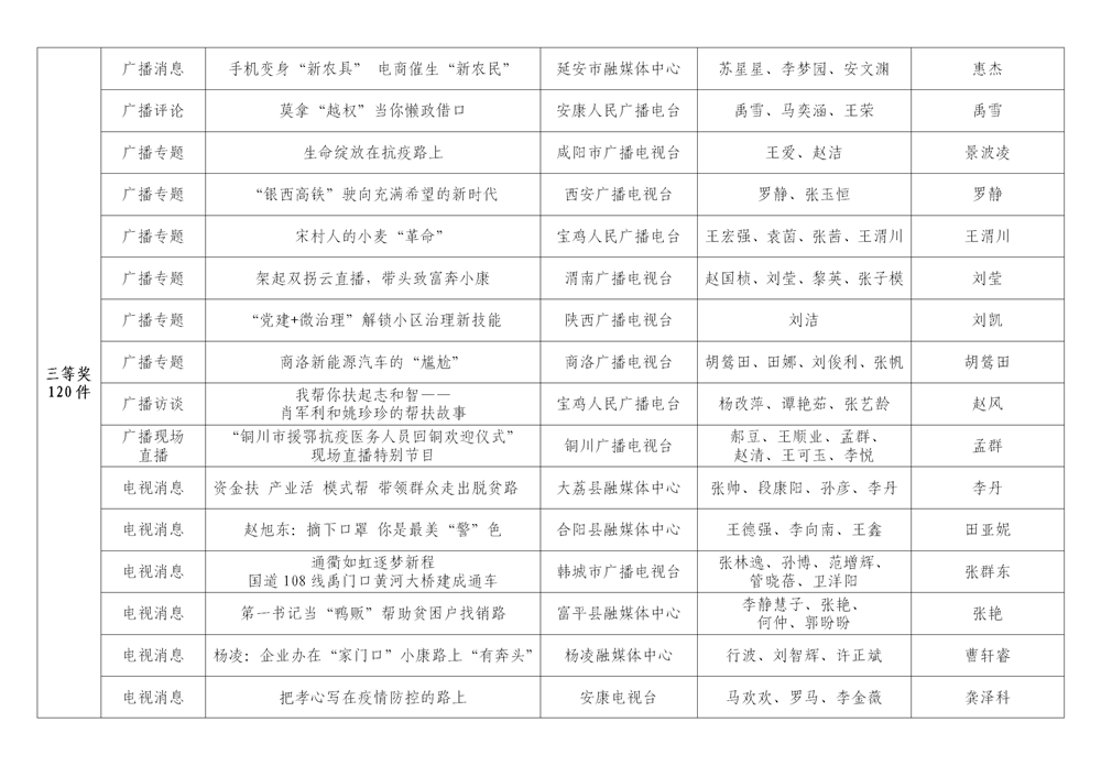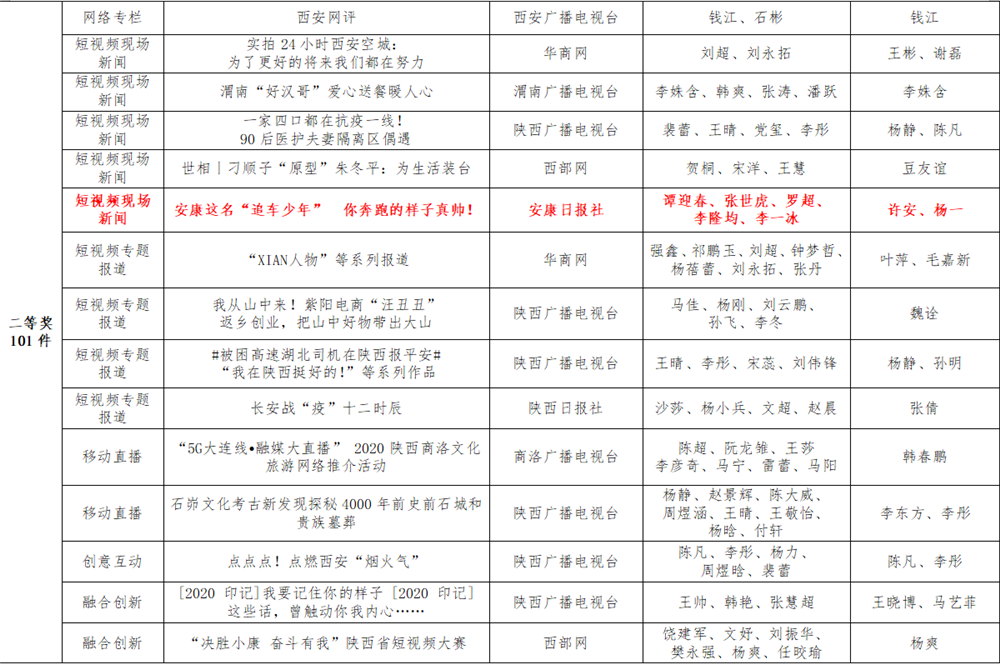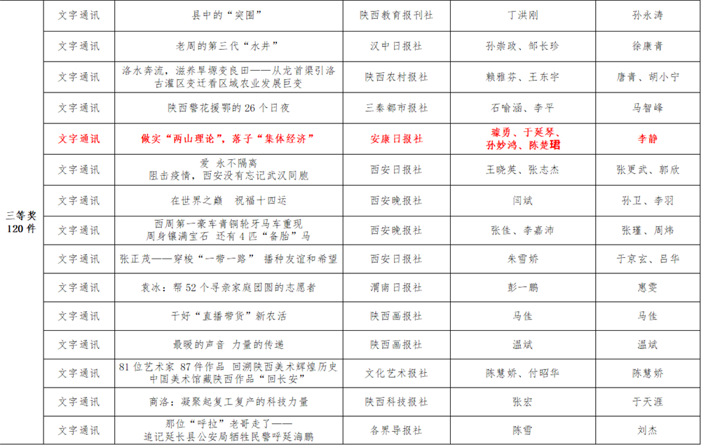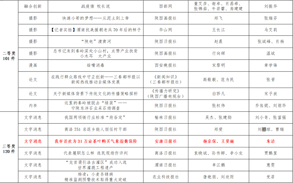 7月6日,陜西省新聞工作者協會公布了2020年度陜西新聞獎、陜西省優秀新聞工作者評選結果,最終評定2020年度陜西新聞獎獲獎作品281件,其中一等獎作品60件、二等獎作品101件、三等獎作品120件;10件作品獲2020年度陜西新聞獎“中央、省外媒體特別獎”;12名新聞工作者獲得陜西省優秀新聞工作者稱號。Ynz安康新聞網