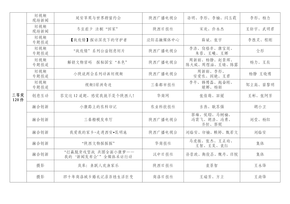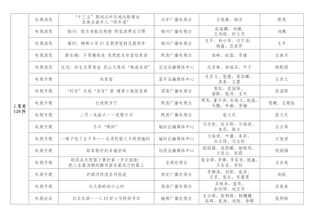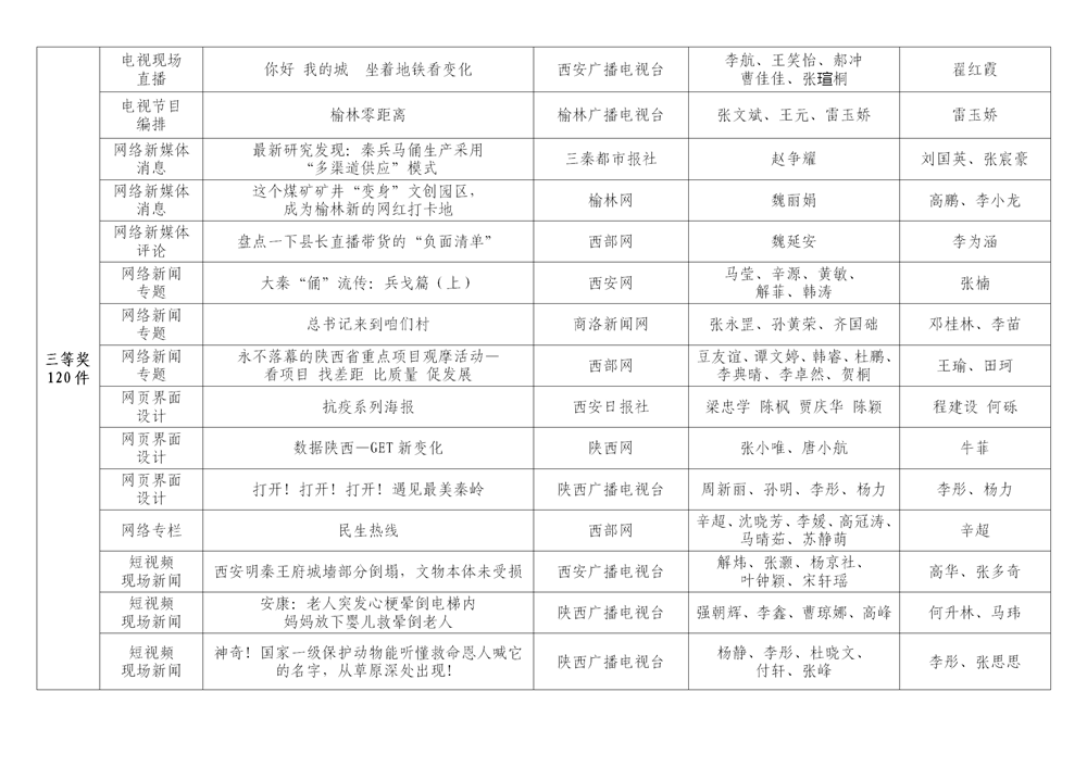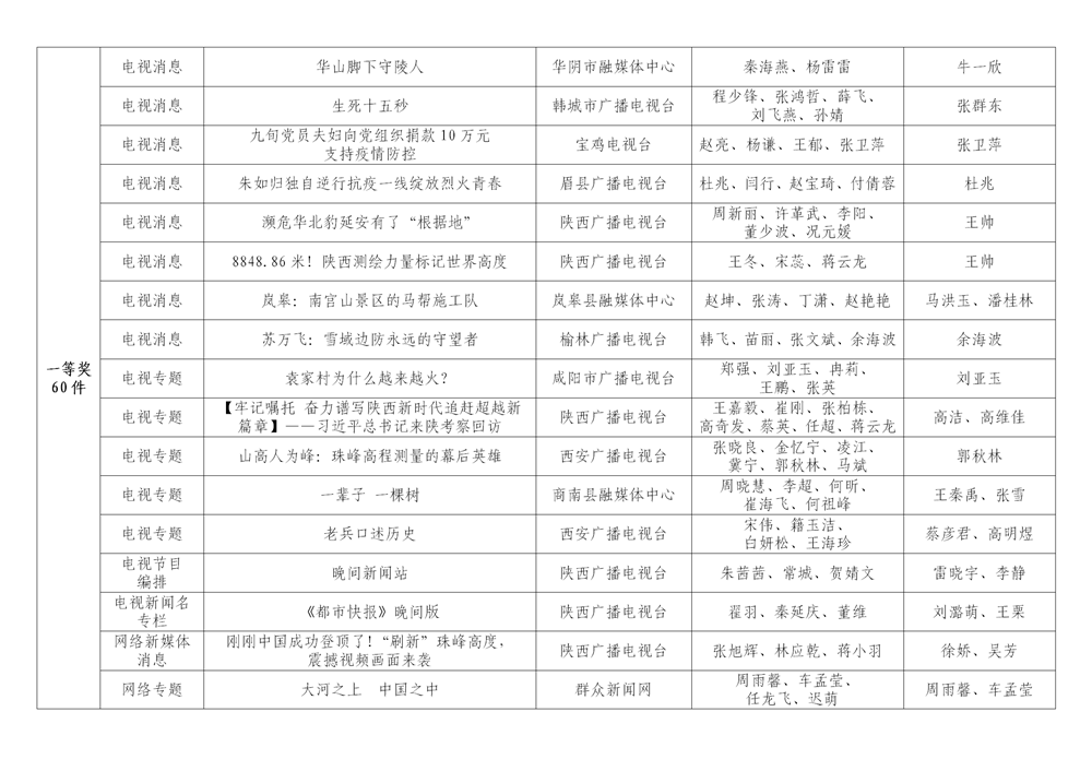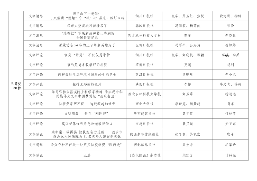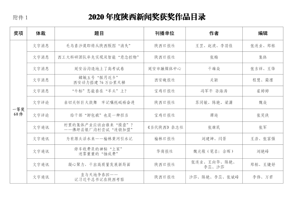 7月6日,陜西省新聞工作者協會公布了2020年度陜西新聞獎、陜西省優秀新聞工作者評選結果,最終評定2020年度陜西新聞獎獲獎作品281件,其中一等獎作品60件、二等獎作品101件、三等獎作品120件;10件作品獲2020年度陜西新聞獎“中央、省外媒體特別獎”;12名新聞工作者獲得陜西省優秀新聞工作者稱號。Ynz安康新聞網