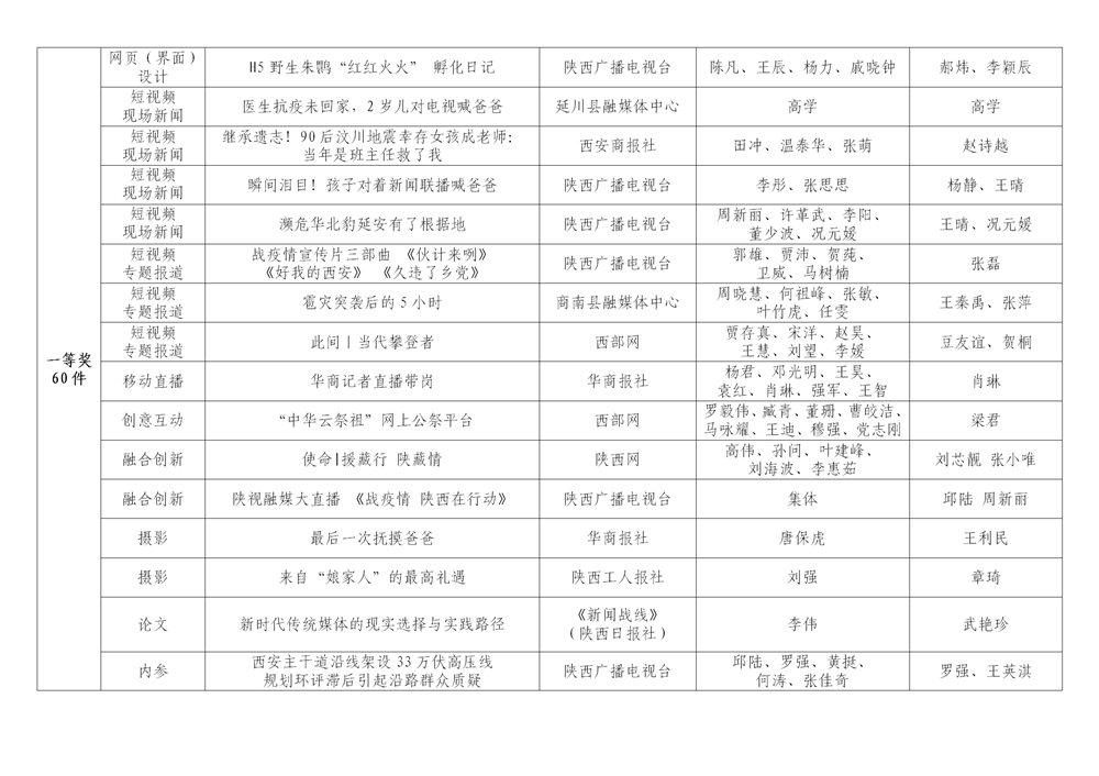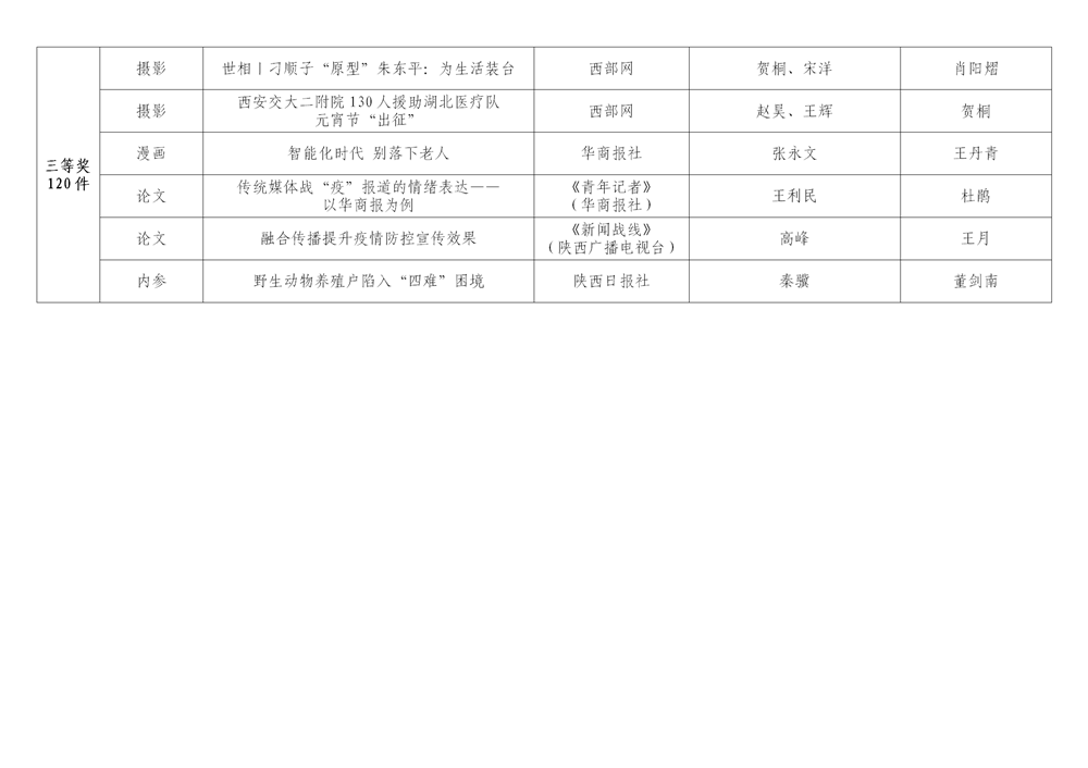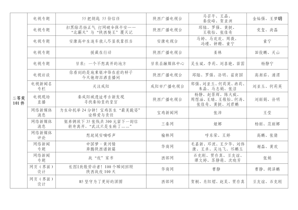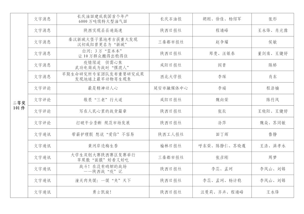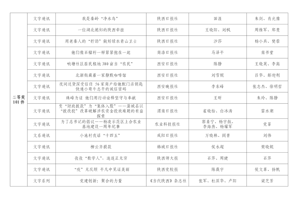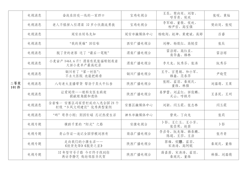 7月6日,陜西省新聞工作者協會公布了2020年度陜西新聞獎、陜西省優秀新聞工作者評選結果,最終評定2020年度陜西新聞獎獲獎作品281件,其中一等獎作品60件、二等獎作品101件、三等獎作品120件;10件作品獲2020年度陜西新聞獎“中央、省外媒體特別獎”;12名新聞工作者獲得陜西省優秀新聞工作者稱號。Ynz安康新聞網