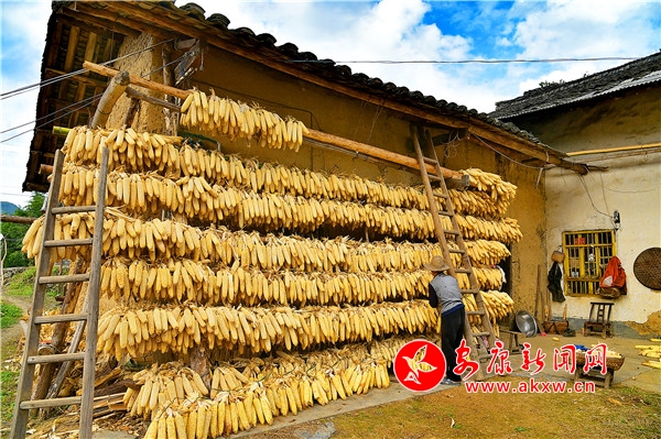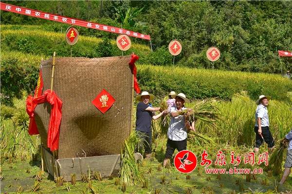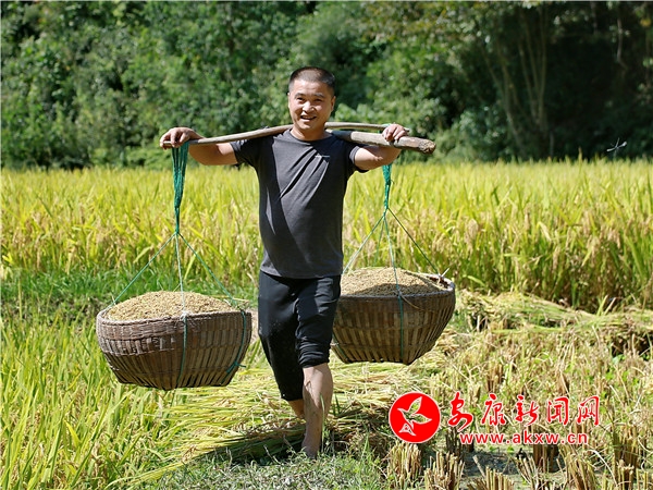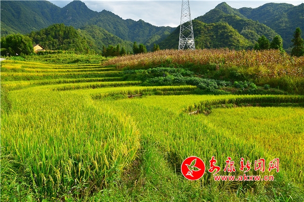 秋日,平利鄉村田園間梯田層層,稻浪滾滾,飽滿的谷穗壓彎了稻桿,放眼望去,遍野鋪金,空氣中也彌漫著淡淡的稻香。在西河鎮女媧山村三里溝原生態水稻田里,人們按照傳統的習俗和方式收割水稻,數十位村民手持鐮刀一字排開,迅速揮舞著手中的鐮刀,將金黃的稻穗割下并整齊的堆放。打谷人則分為兩組,兩人一組,交叉替換的將手中的稻秧在拌桶里反復甩打脫粒,拌谷聲“嘭呲嘭呲”有節奏地作響,聲勢頗為壯觀。與此同時,廣佛鎮松河村李家坡的農家小院已堆滿收回來的苞谷,郭老漢正在將苞谷殼撕開,編成串掛在屋檐下的竹竿上晾曬,金黃的苞谷棒子整齊排列,儼然一幅鄉村小院秋實圖。