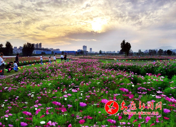 近日,位處安康東郊黃洋河畔城東新區綠地公園數百畝格桑花競相開放,如茵的草地,蕩漾的花海,每天吸引著絡繹不絕的市民前來觀賞和游玩,很快成為安康新的網紅打卡地。 (攝影 趙波)Kjr安康新聞網