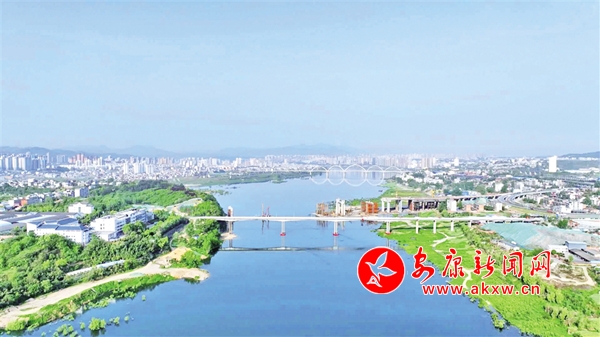 4月16日,安康城東。四橋在靜謐的漢江上倒映出五環,遠處的西城閣和濱江大道與鱗次櫛比的住宅小區形成了一幅城市風景畫。二橋、四橋相互輝映。 陳梅 攝