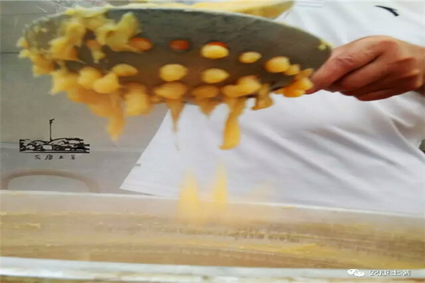 熬煮熟的粉/面漿,即將迎來“名副其實”的關鍵一步,大勺子舀起粉/面漿,倒入漏勺,用勺底來回碾壓,一條條“小魚”就從漏勺底下躍入鍋中,隨著水花起舞。