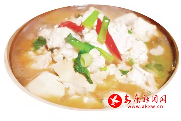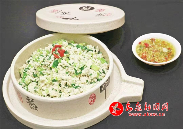 以石磨豆腐、小青菜為主要食材,制作時首先把豆腐捏碎,然后把青菜切成碎,在豆腐里面加入一個雞蛋,攪拌均勻。起鍋燒豬油下入蒜末炒香,倒入青菜、豆腐、炒熱,然后調味,在配上一小碟提前準備好的大蒜辣椒,吃著既有豆腐的醇香,又有青菜的清淡,營養價值也很較高。mwn安康新聞網