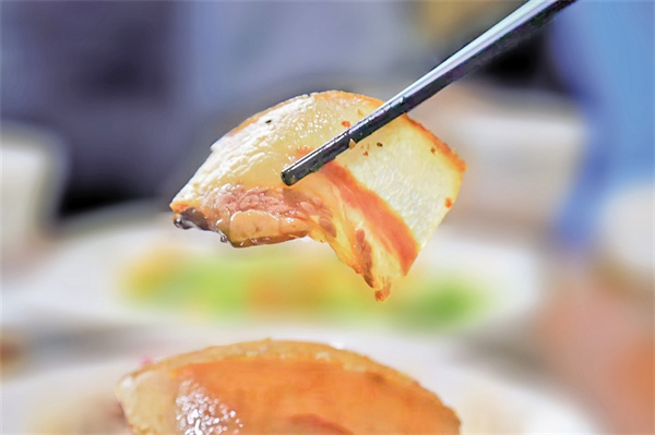 嵐皋臘味堪稱時間雕刻的藝術,四季鎮的楊家院子里,當地每家每戶仍用古法腌制“倒掛金鉤”。將土豬肉抹上花椒、橘子皮與苞谷酒,在巴山夜雨的潮潤與三冬暖陽的干燥間交替風干三年。切片蒸熟的臘肉晶瑩剔透,肥瘦相間,咸香中暗藏果木幽香,入口爽嫩宜人,配以土灶新蒸的洋芋米飯,便是客路游子最深的鄉愁。小城的街頭同樣藏著流動的盛宴,冬日里挑擔叫賣的“烤紅薯”;北門坡老金家木槌現打的糯米飯團,在炭火上炙烤,待表面焦脆后填入芝麻糖餡;老菜市場樹蔭下的“漿巴饃”攤前,玉米漿發酵的酸香混著桐葉清香,勾住每個過路人的腳步。這些市井美味,構成了嵐皋人記憶里的坐標。