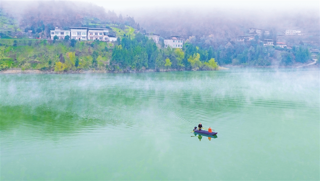 寒冬時節,瀛湖蓄水,沙坪河展現出不同往昔的靜謐風姿。清晨,薄霧如紗,輕輕覆于江面。遠山輪廓在氤氳中淡去,近水卻愈顯澄明,倒映著天際微光。時有早行的客船從霧中緩緩現出身形,馬達聲不時驚起三兩水鳥;漁人輕搖小舟,如在云中穿行。這朦朧流動的晨景,恍若水墨漫染的仙境。