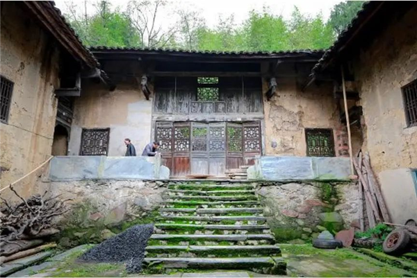 經天井院上九步石梯到長廊,此廊為石栓石欄。正面堂屋為六開槅扇門,門窗為土木雕刻工藝,國文壽字,古銅錢、蝙蝠、冬瓜圈、梭子圈、卷草等工藝。此處為黃家紙廠議事之地,巧借地勢突出氣勢,雖只兩層,卻與兩邊三層廂房等高,借助前面的大天井采光,構成院中府第,顯然是吸取了湖廂府衙式建筑理念。從堂屋前的過道可通往東西兩側小天井,面向大門,西側小天井因地勢縮進2米,但建有曬樓(陽臺),雖然天井狹小,但天井里鑿內池、留溝防、設路徑、安石碑,甚至連置盆栽種都應有盡有,雖然時光侵蝕,破損嚴重,但遺跡清晰可辨,足見主人生活饒有情趣。