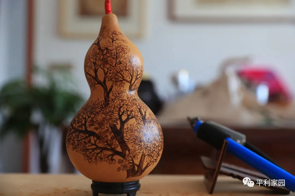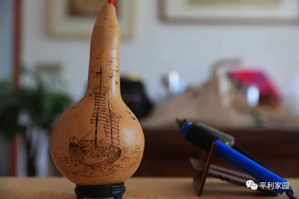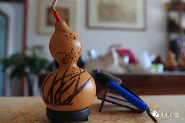 一組葫蘆,明黃里透出古色,熠熠生輝的畫幅里,平利雄山秀水滴滴溢出,一時間,香氣四溢,鄉風彌漫,整個房間便裝滿女媧故里平利的山山壑壑。