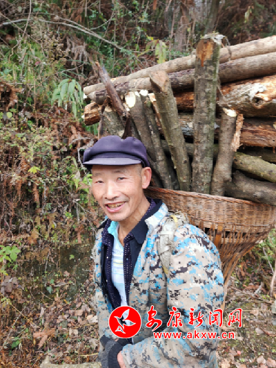 途中,偶遇一砍柴老農(nóng),身著迷彩雨衣,手腳麻利的將倒地樹木,砍成2尺多長的木段。見來人,憨憨一笑,算是大個(gè)招呼。聊了一會天,得知眼前這位面色紅潤、硬朗的老人,年逾七十。